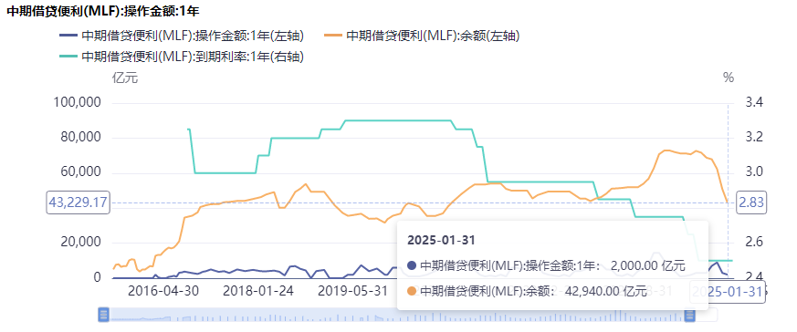 为保持银行体系流动性充裕,2025年1月24日,人民银行开展2000亿元中期借贷便利(MLF)操作,期限1年,最高投标利率2.20%,最低投标利率1.80%,中标利率2.00%。中标利率维持不变。操作后,中期借贷便利余额为42940亿元。