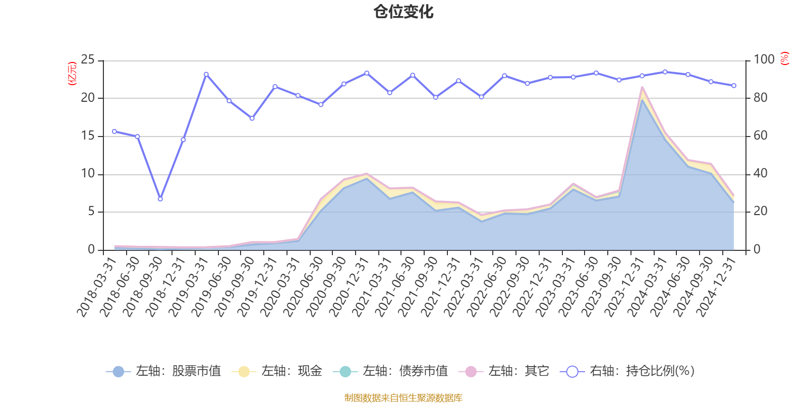 据定期报告数据统计,近三年平均股票仓位为90.01%,同类平均为79.89%。2024年一季度末基金达到93.98%的最高仓位,2018年三季度末最低,为26.99%。