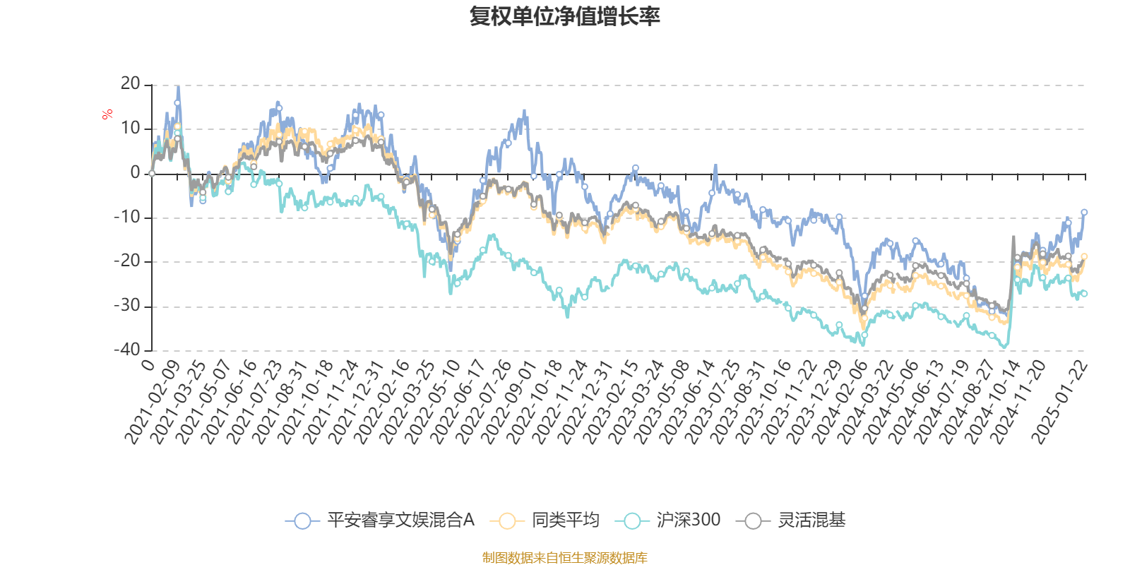 截至1月22日,平安睿享文娱混合A近三个月复权单位净值增长率为11.00%,位于同类可比基金24/920;近半年复权单位净值增长率为19.55%,位于同类可比基金122/920;近一年复权单位净值增长率为20.34%,位于同类可比基金240/920;近三年复权单位净值增长率为-12.34%,位于同类可比基金225/898。
