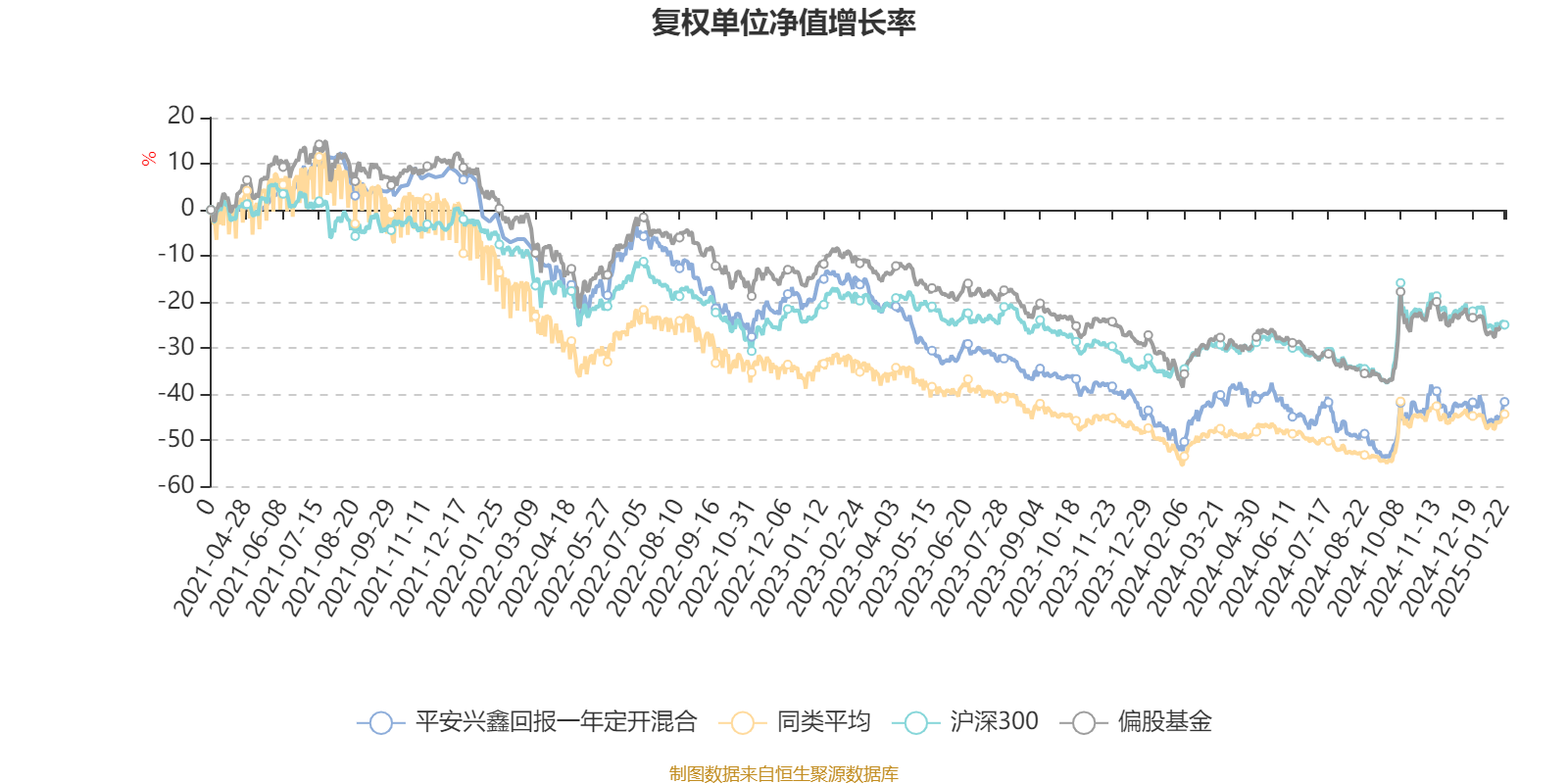 截至1月22日,平安兴鑫回报一年定开混合近三个月复权单位净值增长率为0.36%,位于同类可比基金242/646;近半年复权单位净值增长率为3.94%,位于同类可比基金492/645;近一年复权单位净值增长率为16.39%,位于同类可比基金303/633;近三年复权单位净值增长率为-41.12%,位于同类可比基金414/447。