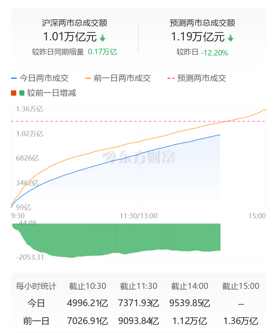 沪深两市成交额连续第9个交易日突破1万亿,较昨日此时缩量超1600亿。
