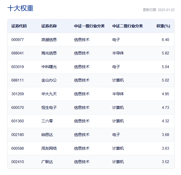 资料显示,信创50ETF紧密跟踪中证信创指数,聚焦信息技术应用创新、自主可控主题,具体投资领域为计算机产业的基础硬件、基础软件、应用软件、信息安全、外部设备等。数据显示,截至2025年1月22日,中证信息技术应用创新产业指数前十大权重股分别为浪潮信息、海光信息、中科曙光、金山办公、华大九天、恒生电子、三六零、纳思达,用友网络、广联达前十大权重股合计占比47.12%。关注信创50ETF(560850),场外联接(A类:021602;C类:021603)!