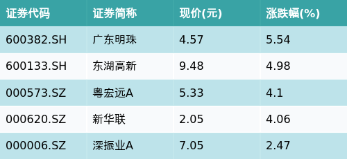 截至收盘,房地产开发主题涨跌幅最高的五只股票为:广东明珠(600382.SH)、东湖高新(600133.SH)、粤宏远A(000573.SZ)、新华联(000620.SZ)与深振业A(000006.SZ)。详情见下表: