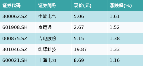 截至收盘,绿色电力主题涨跌幅最高的五只股票为:中能电气(300062.SZ)、京运通(601908.SH)、吉电股份(000875.SZ)、能辉科技(301046.SZ)与上海电力(600021.SH)。详情见下表: