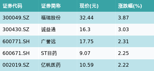 截至收盘,中药主题涨跌幅最高的五只股票为:福瑞股份(300049.SZ)、诚益通(300430.SZ)、广誉远(600771.SH)、ST目药(600671.SH)与亿帆医药(002019.SZ)。详情见下表: