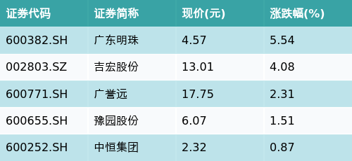 截至收盘,白酒概念主题涨跌幅最高的五只股票为:广东明珠(600382.SH)、吉宏股份(002803.SZ)、广誉远(600771.SH)、豫园股份(600655.SH)与中恒集团(600252.SH)。详情见下表:
