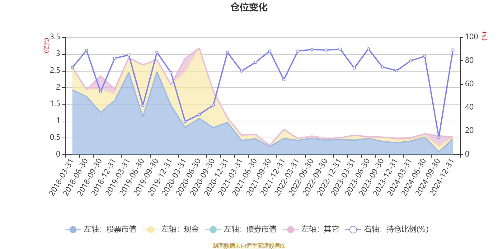 据定期报告数据统计,近三年平均股票仓位为77.91%,同类平均为79.9%。2023年上半年末基金达到90.18%的最高仓位,2024年三季度末最低,为14.66%。