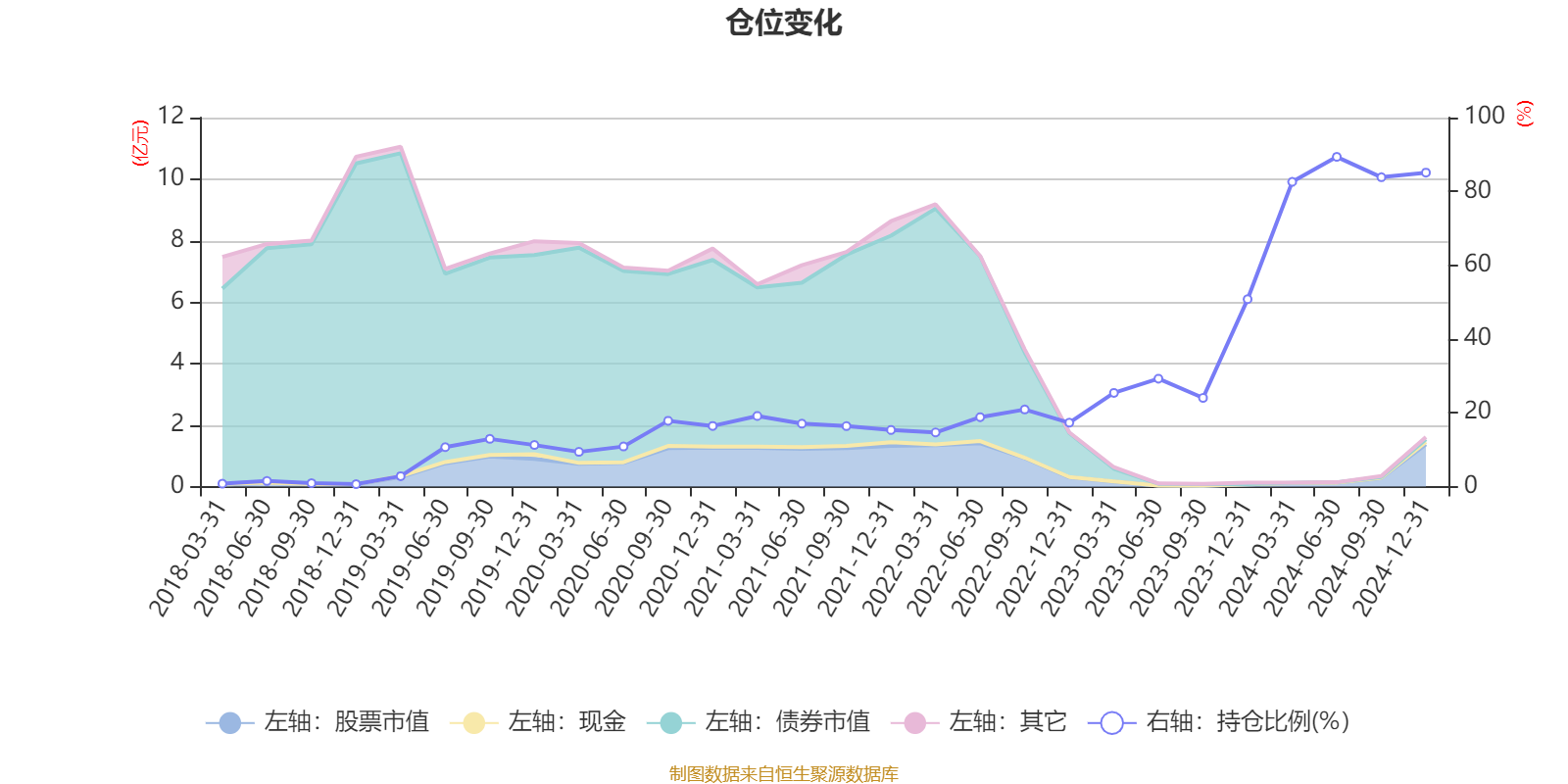 据定期报告数据统计,近三年平均股票仓位为45.17%,同类平均为79.9%。2024年上半年末基金达到89.36%的最高仓位,2018年末最低,为0.65%。