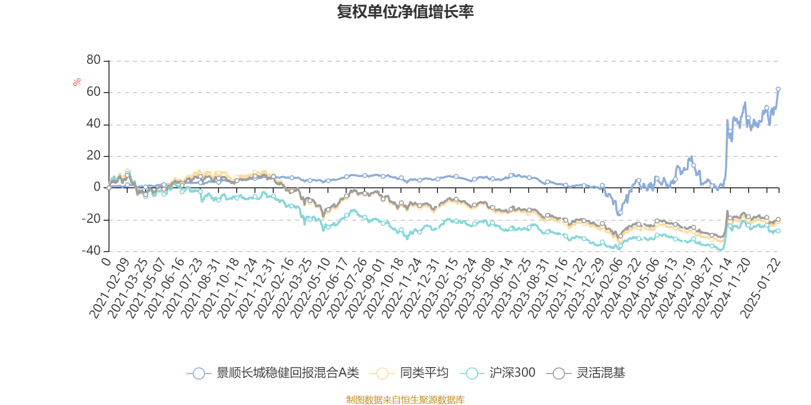 截至1月22日,景顺长城稳健回报混合A类近三个月复权单位净值增长率为11.98%,位于同类可比基金24/920;近半年复权单位净值增长率为41.52%,位于同类可比基金6/920;近一年复权单位净值增长率为81.80%,位于同类可比基金2/920;近三年复权单位净值增长率为51.77%,位于同类可比基金2/898。
