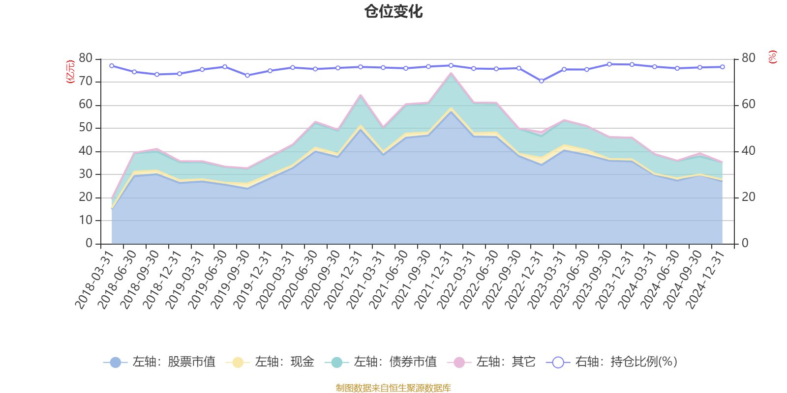据定期报告数据统计,近三年平均股票仓位为75.83%,同类平均为85.84%。2023年三季度末基金达到77.74%的最高仓位,2022年末最低,为70.51%。
