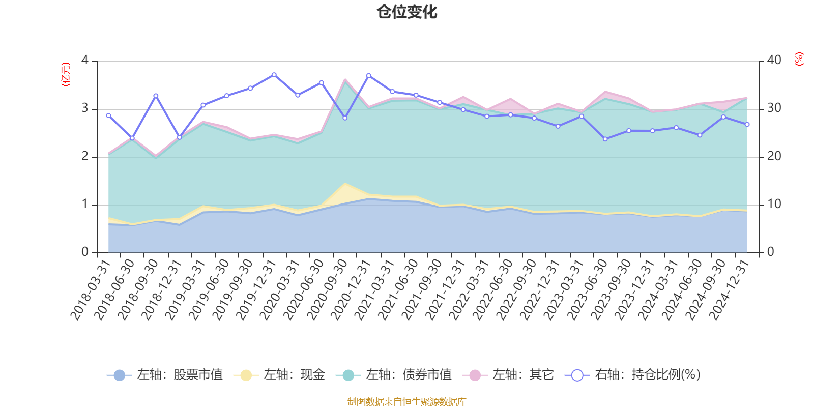 据定期报告数据统计,近三年平均股票仓位为26.71%,同类平均为18.74%。2019年末基金达到37.13%的最高仓位,2023年上半年末最低,为23.71%。