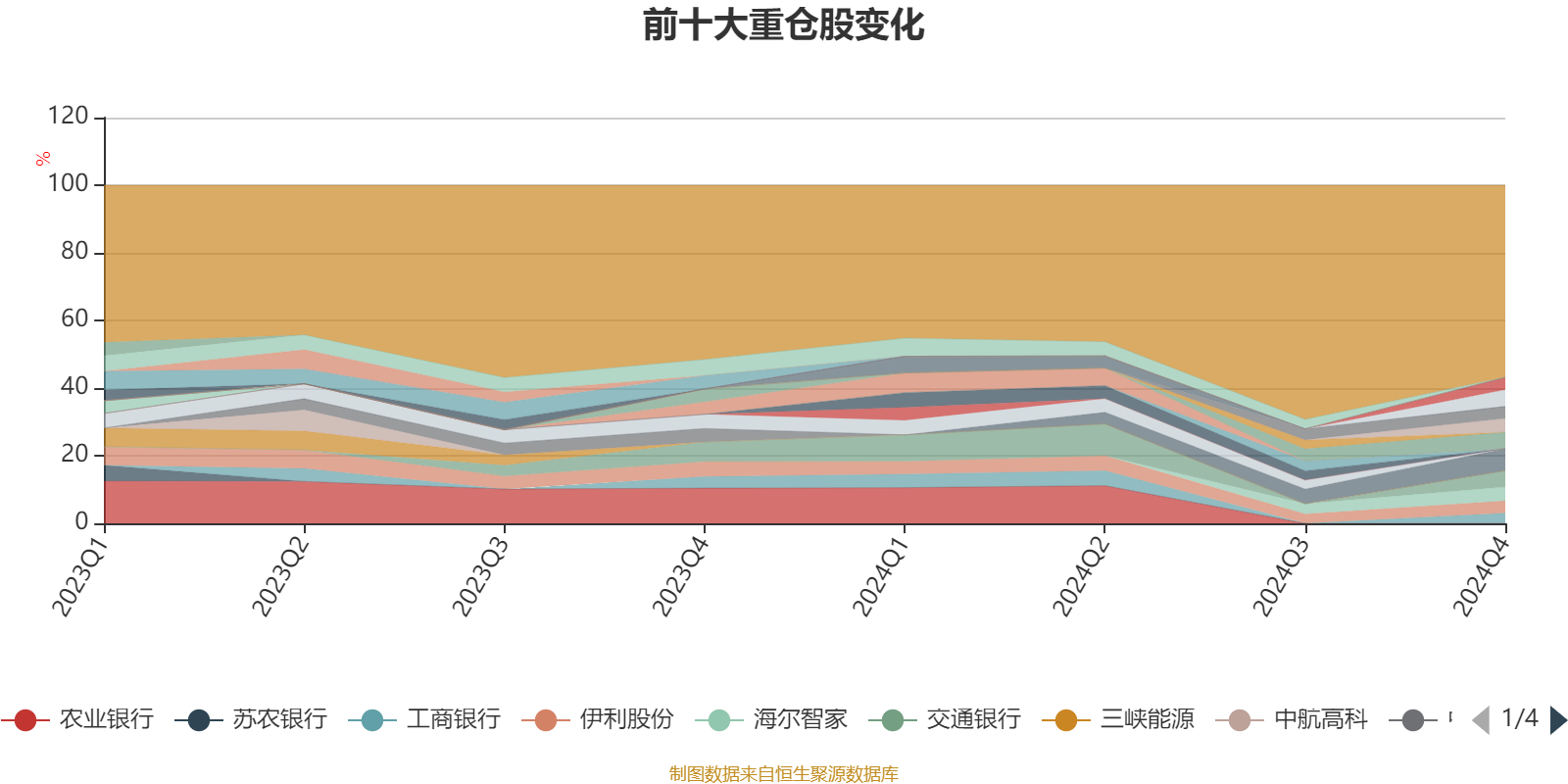 截至2024年四季度末,基金十大重仓股分别是五粮液、交通银行、浙江鼎力、海澜之家、北方华创、海尔智家、星宇股份、伊利股份、常熟汽饰、工商银行。