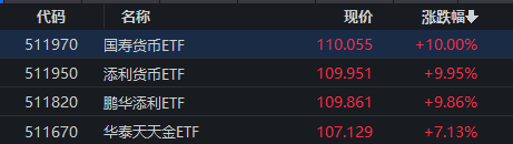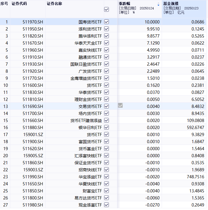 罕见!1月24日午后,多只货币基金异动拉升,盘中一度触及涨停,截至收盘,国寿货币ETF(511970)、添利货币ETF(511950)、鹏华添利ETF(511820)涨停,华泰天天金(511670)、嘉实快线ETF(511960)等跟涨。
