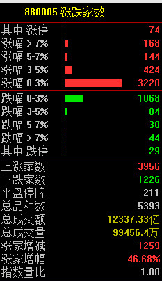 市场共3956只个股上涨,74只个股涨停,1226只个股下跌。