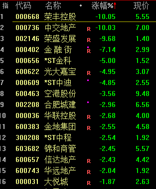 下跌方面,房地产板块走低,中交地产、荣盛发展跌停。