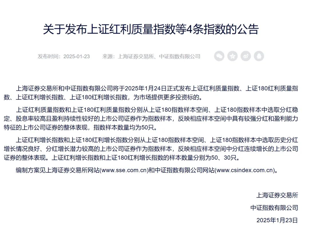 1月24日,上海证券交易所和中证指数有限公司正式发布4条红利指数,分别为上证红利质量指数、上证180红利质量指数、上证红利增长指数和上证180红利增长指数。这将进一步丰富红利指数体系,为市场提供更多投资标的。