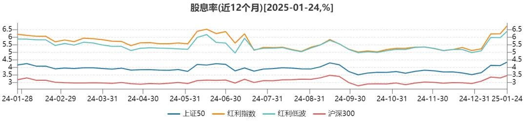 数据显示,截至1月24日,近12个月以来,红利指数和红利低波指数的股息率分别为6.75%和6.39%,远高于主流宽基指数。对此,业内人士分析称,临近春节,红利相关指数成分股迎来派息高峰,因此,推动了相关指数股息水平的提升。