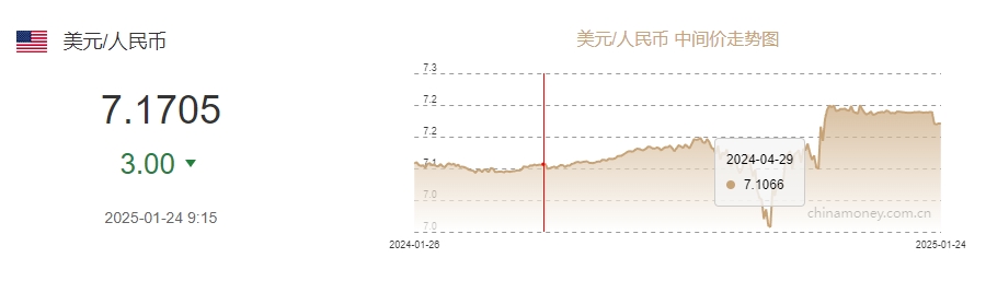 中新网1月24日电据中国外汇交易中心网站消息,中国人民银行授权中国外汇交易中心公布,2025年1月24日银行间外汇市场人民币汇率中间价为:1美元对人民币7.1705元,上调3个基点。