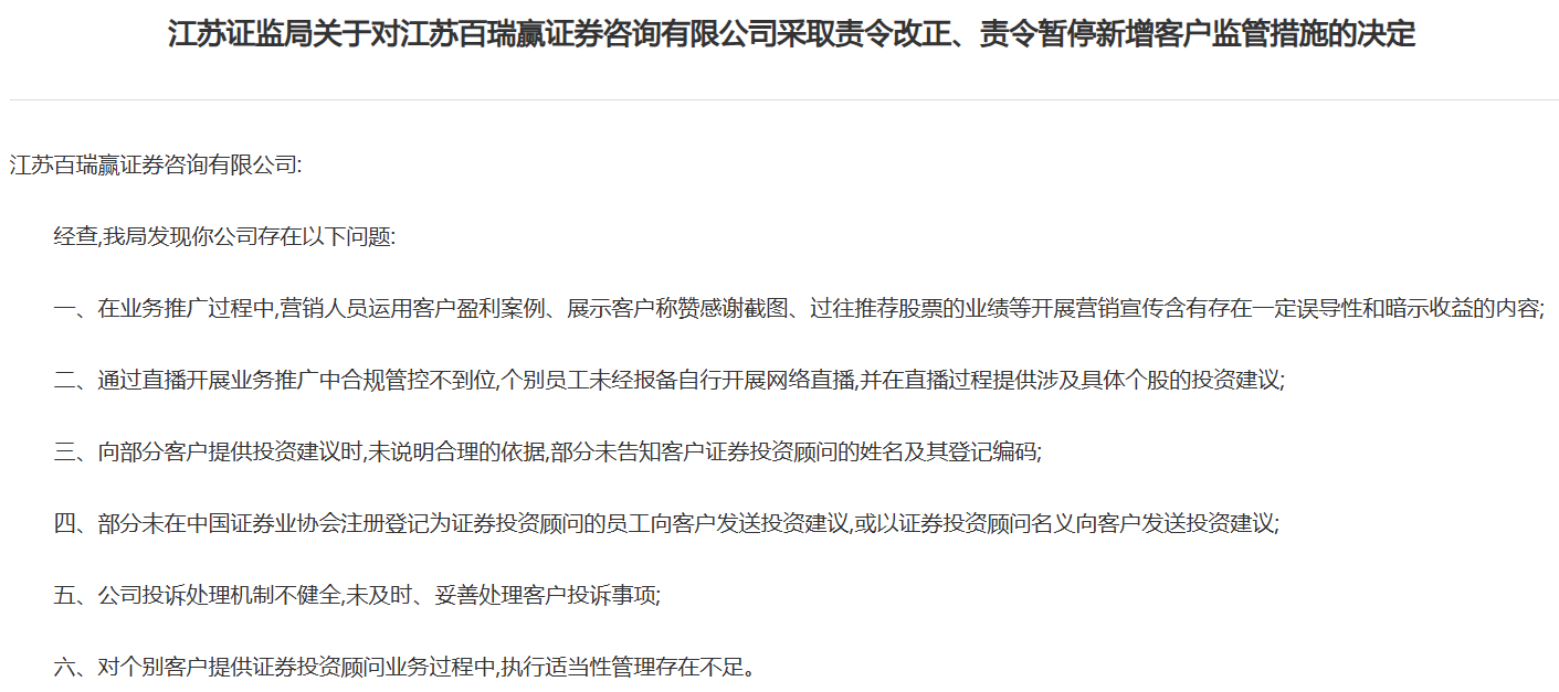 存在6项违规!江苏百瑞赢证券咨询被责令改正、暂停新增客户半年