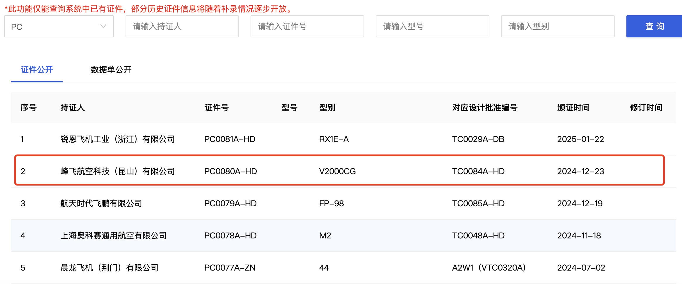 峰飞航空V2000CG(载物)获颁生产许可证 推动量产及商业化应用