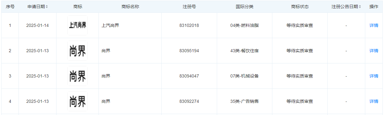 天眼查显示,1月13日至1月14日,上海汽车集团股份有限公司新提交“尚界”、“上汽尚界”等多枚商标,国际分类涉及机械设备和广告销售等,商标状态均为等待实质审查。