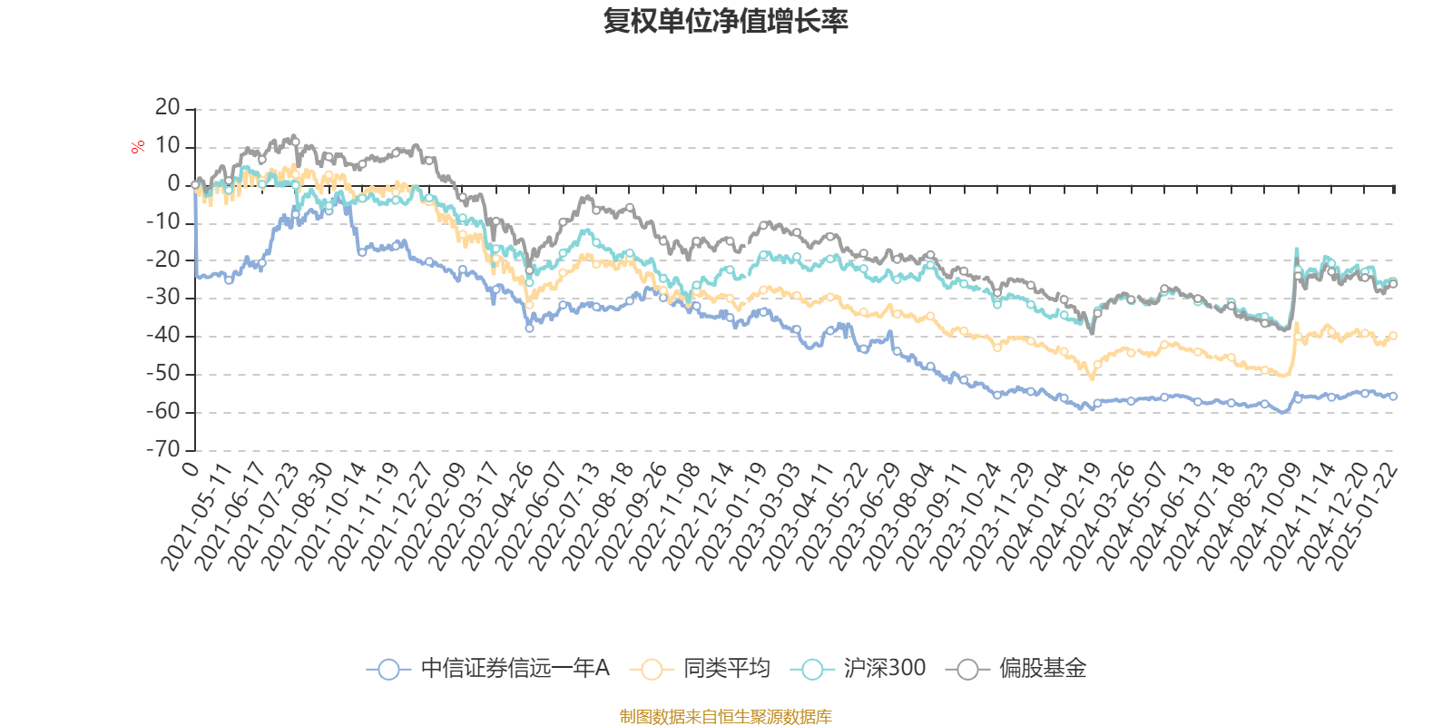 截至1月22日,中信证券信远一年A近三个月复权单位净值增长率为0.00%,位于同类可比基金183/536;近半年复权单位净值增长率为4.70%,位于同类可比基金359/536;近一年复权单位净值增长率为8.31%,位于同类可比基金348/500;近三年复权单位净值增长率为-42.14%,位于同类可比基金226/265。