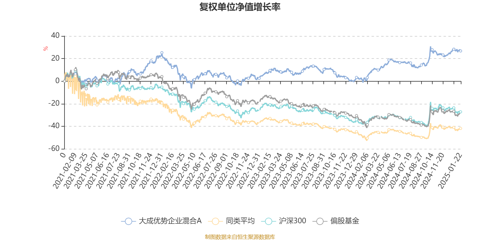 截至1月22日,大成优势企业混合A近三个月复权单位净值增长率为0.20%,位于同类可比基金37/135;近半年复权单位净值增长率为9.46%,位于同类可比基金58/135;近一年复权单位净值增长率为28.27%,位于同类可比基金19/135;近三年复权单位净值增长率为7.47%,位于同类可比基金8/127。