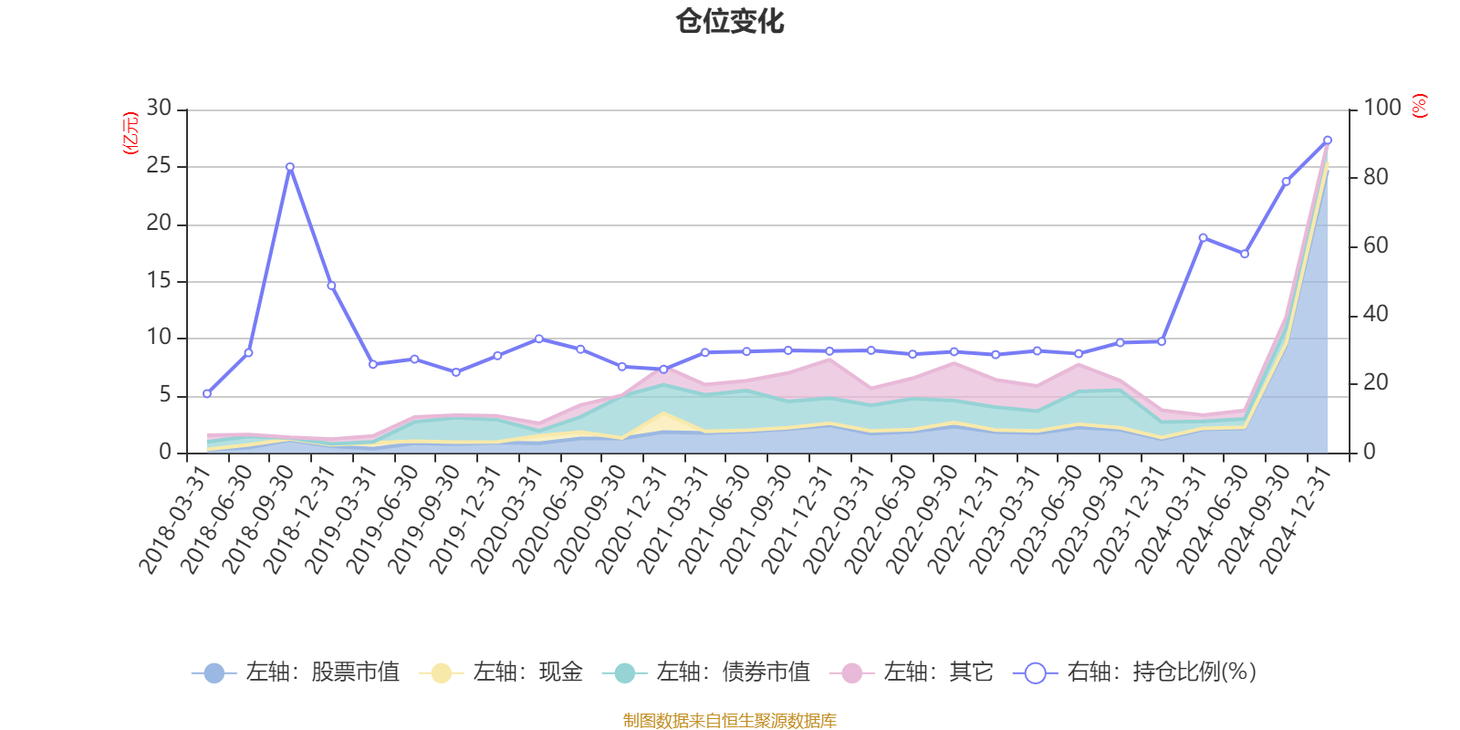 据定期报告数据统计,近三年平均股票仓位为44.24%,同类平均为41.78%。2024年末基金达到91.08%的最高仓位,2018年一季度末最低,为17.28%。