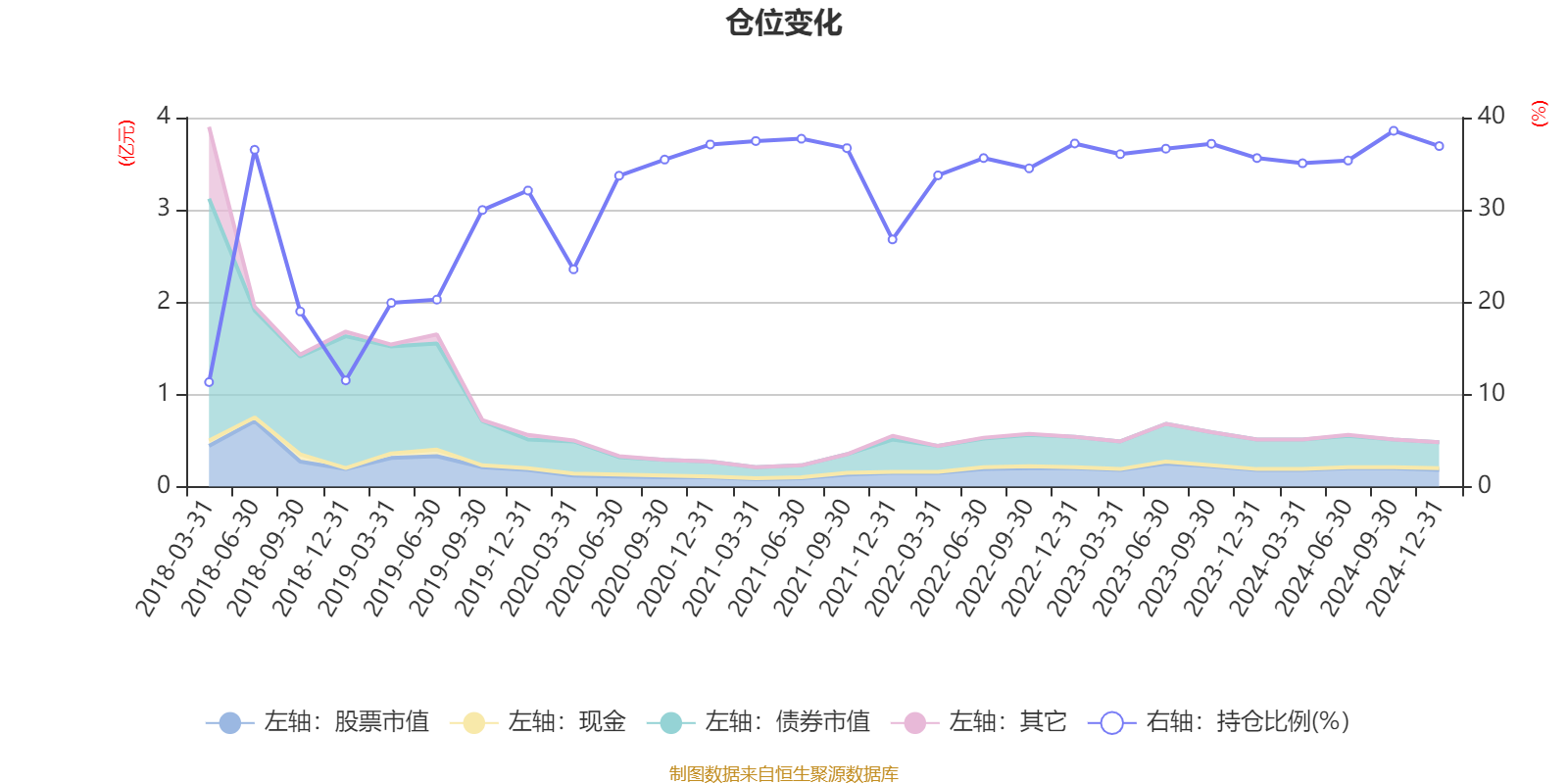 据定期报告数据统计,近三年平均股票仓位为36.03%,同类平均为18.74%。2024年三季度末基金达到38.57%的最高仓位,2018年一季度末最低,为11.32%。