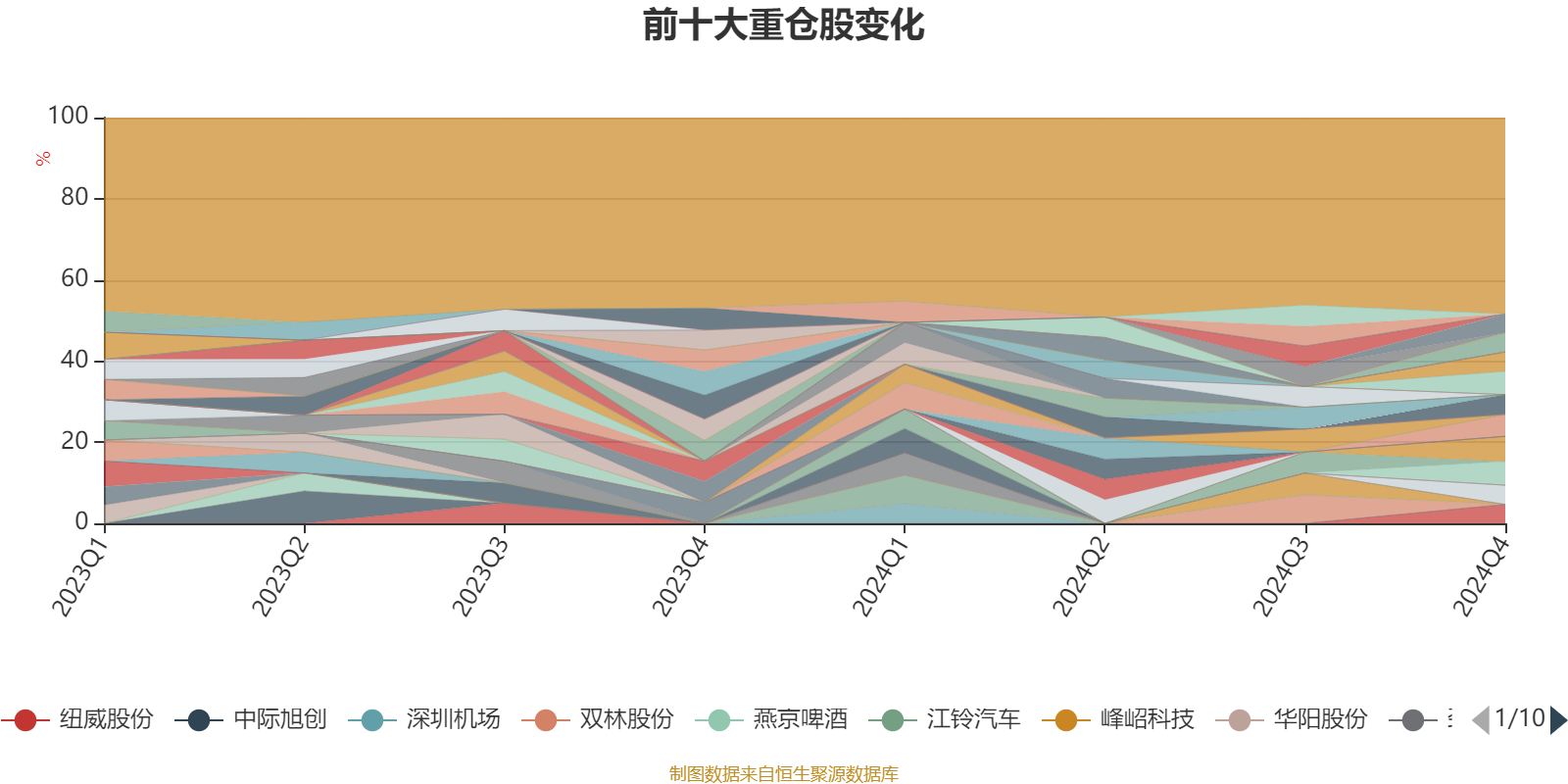截至2024年四季度末,基金十大重仓股分别是浙江自然、东鹏饮料、赛力斯、博威合金、沪光股份、电投能源、天味食品、云天化、纽威股份、瑞达期货。