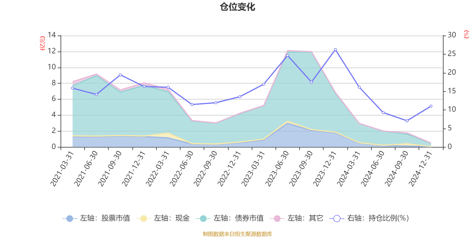 据定期报告数据统计,近三年平均股票仓位为15.15%,同类平均为18.51%。2023年末基金达到26.23%的最高仓位,2024年三季度末最低,为7.08%。