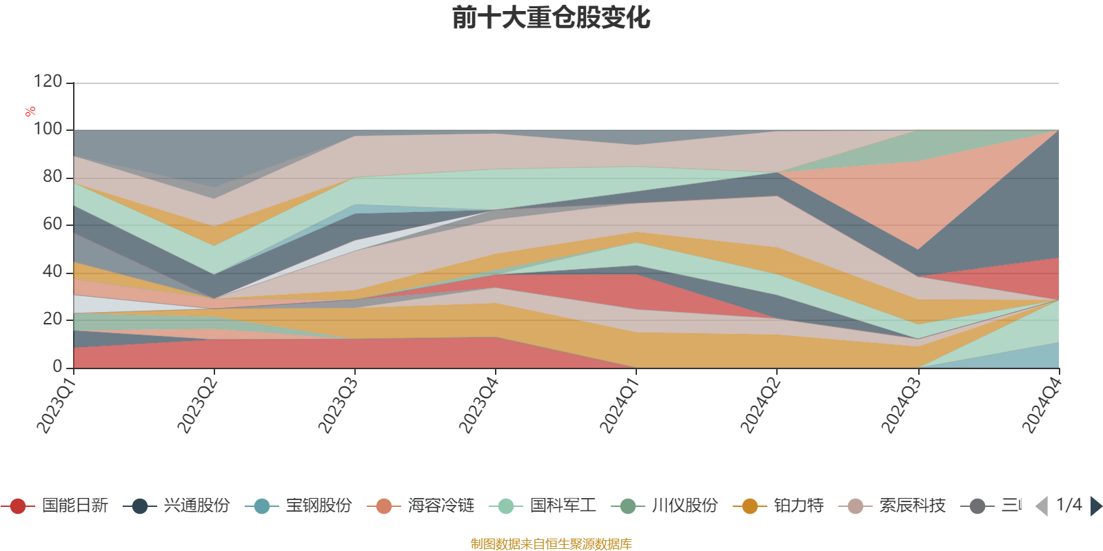 该基金持股集中度较高,近2年前十大重仓股集中度长期超过60%。截至2024年四季度末,基金重仓股分别是容知日新、国科军工、中国汽研、宝钢股份。