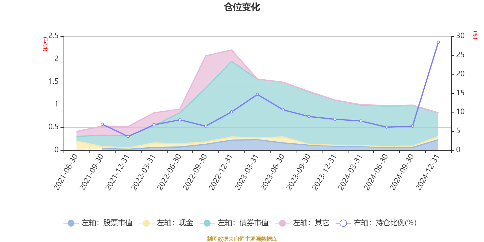 据定期报告数据统计,近三年平均股票仓位为10.17%,同类平均为18.74%。2024年末基金达到28.47%的最高仓位,2021年末最低,为3.61%。