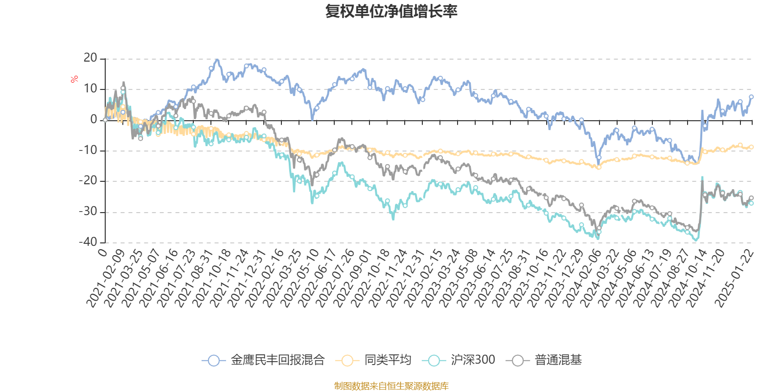 截至1月22日,金鹰民丰回报混合近三个月复权单位净值增长率为6.47%,位于同类可比基金7/670;近半年复权单位净值增长率为15.74%,位于同类可比基金8/670;近一年复权单位净值增长率为17.85%,位于同类可比基金13/664;近三年复权单位净值增长率为-4.69%,位于同类可比基金455/525。