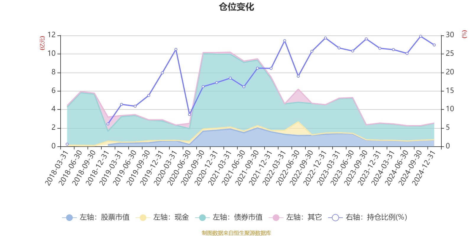 据定期报告数据统计,近三年平均股票仓位为26.58%,同类平均为18.74%。2024年三季度末基金达到29.76%的最高仓位,2018年一季度末最低,为0.62%。