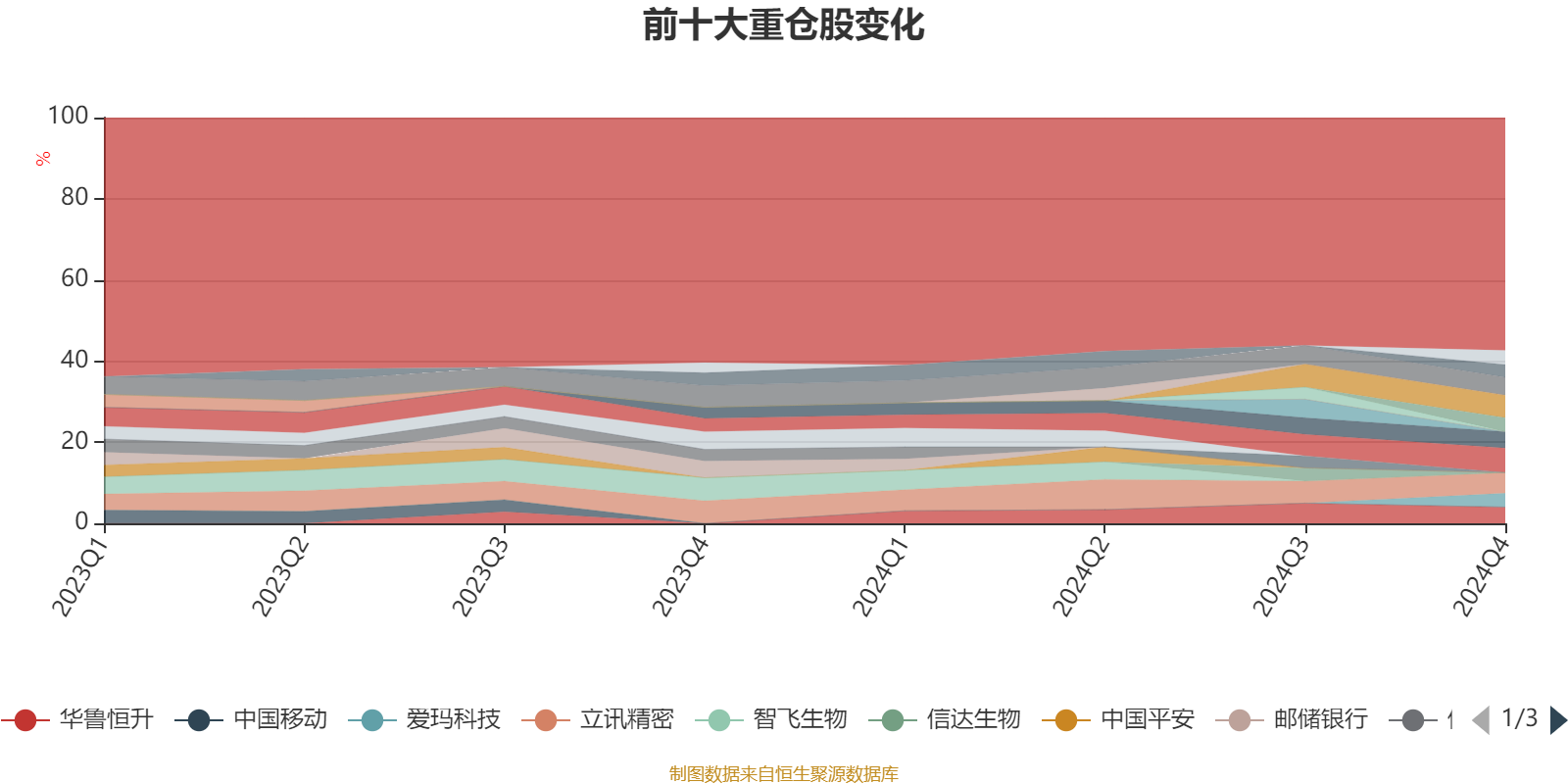 截至2024年四季度末,基金十大重仓股分别是腾讯控股、浦发银行、立讯精密、荣盛石化、华鲁恒升、安踏体育、益丰药房、生益科技、爱玛科技、华能国际。