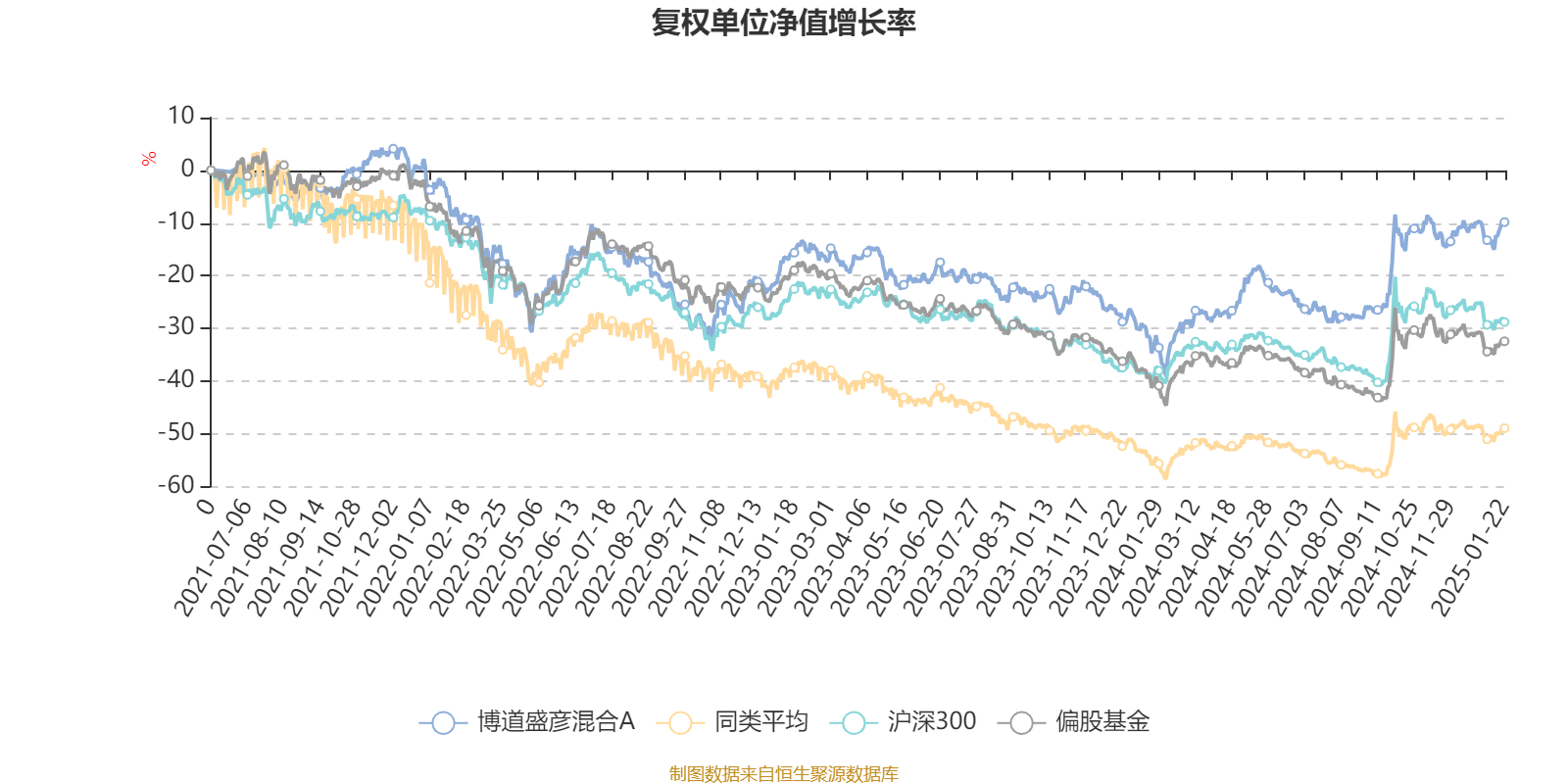 截至1月22日,博道盛彦混合A近三个月复权单位净值增长率为1.62%,位于同类可比基金179/646;近半年复权单位净值增长率为21.43%,位于同类可比基金85/645;近一年复权单位净值增长率为38.13%,位于同类可比基金43/633;近三年复权单位净值增长率为-6.98%,位于同类可比基金55/447。