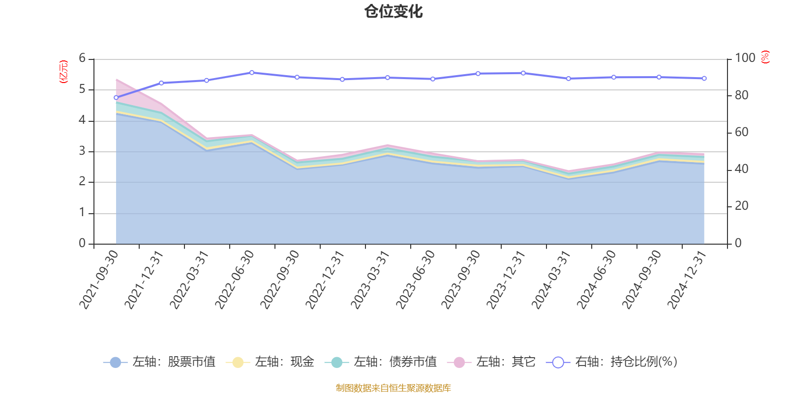 据定期报告数据统计,近三年平均股票仓位为90.24%,同类平均为84.97%。2022年上半年末基金达到92.64%的最高仓位,2021年三季度末最低,为79.12%。