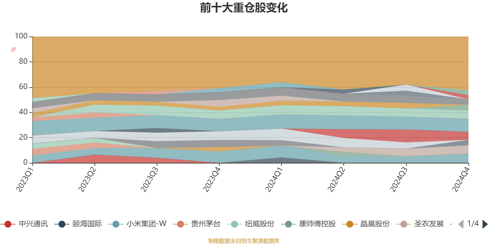 该基金持股集中度较高。截至2024年四季度末,基金十大重仓股分别是腾讯控股、小米集团-W、圣农发展、中通快递-W、豪迈科技、江苏银行、心动公司、玲珑轮胎、药明生物、科创新源。