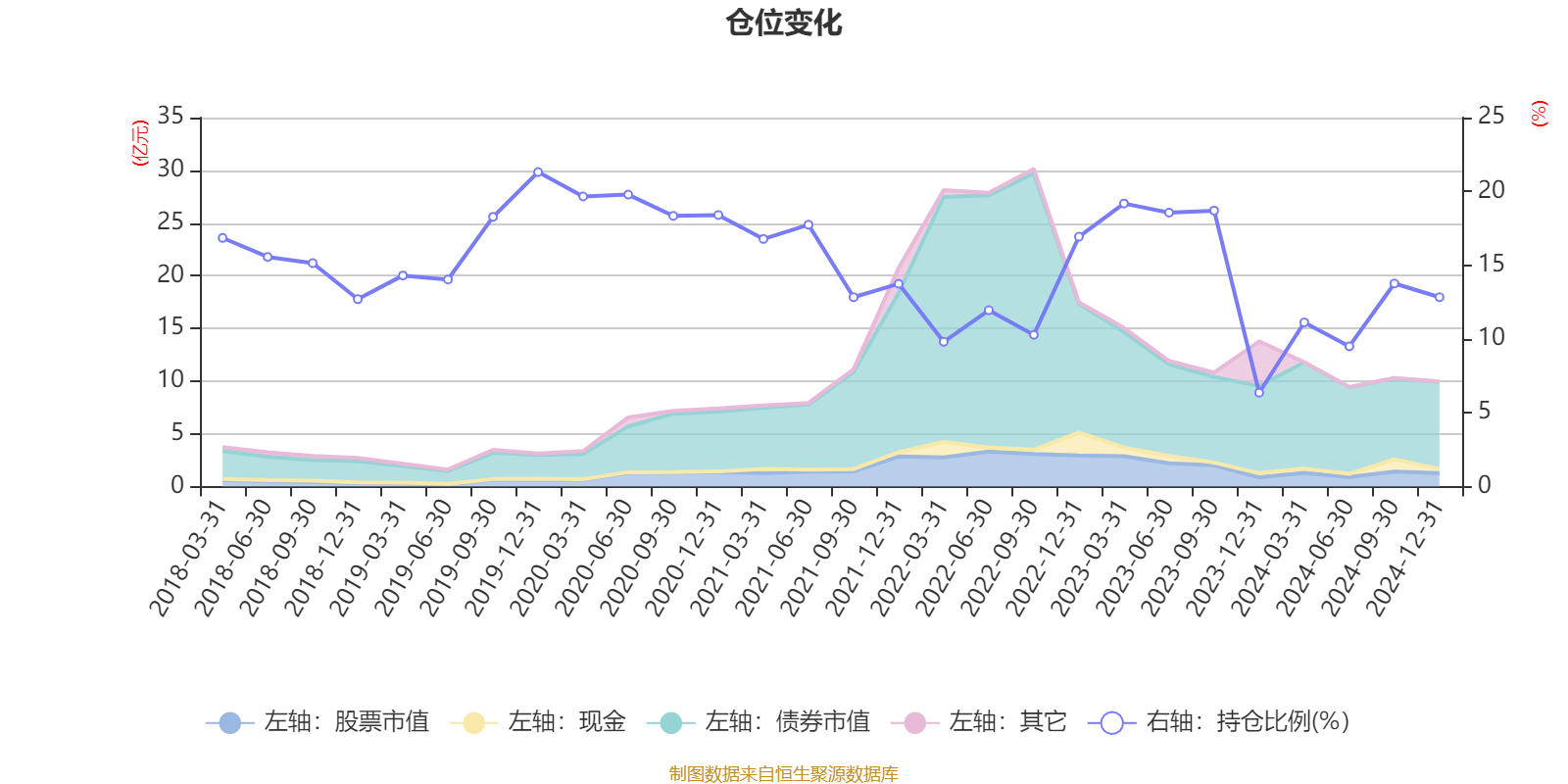 据定期报告数据统计,近三年平均股票仓位为13.25%,同类平均为18.74%。2019年末基金达到21.31%的最高仓位,2023年末最低,为6.36%。