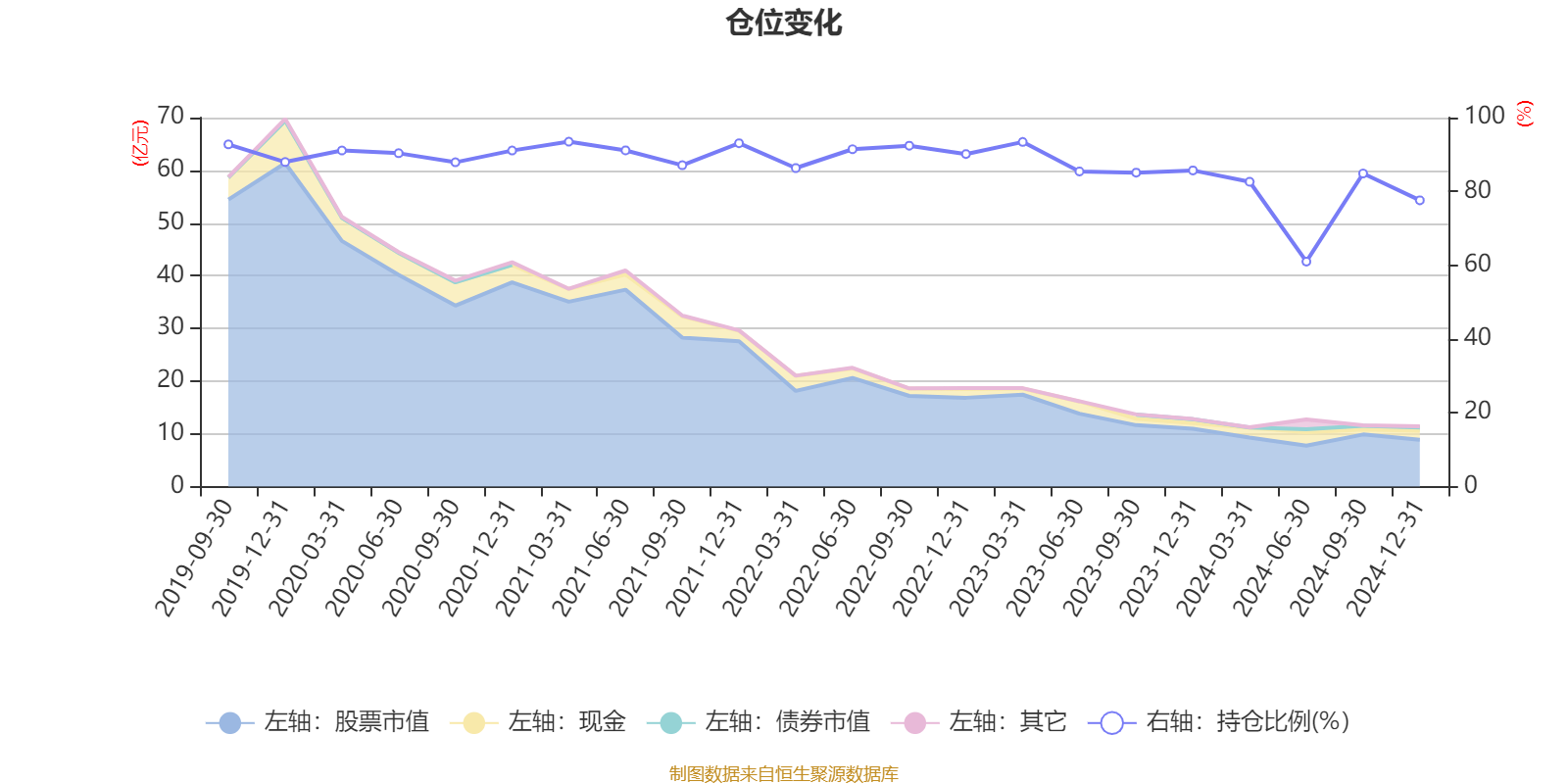 据定期报告数据统计,近三年平均股票仓位为84.66%,同类平均为79.9%。2021年一季度末基金达到93.48%的最高仓位,2024年上半年末最低,为60.97%。