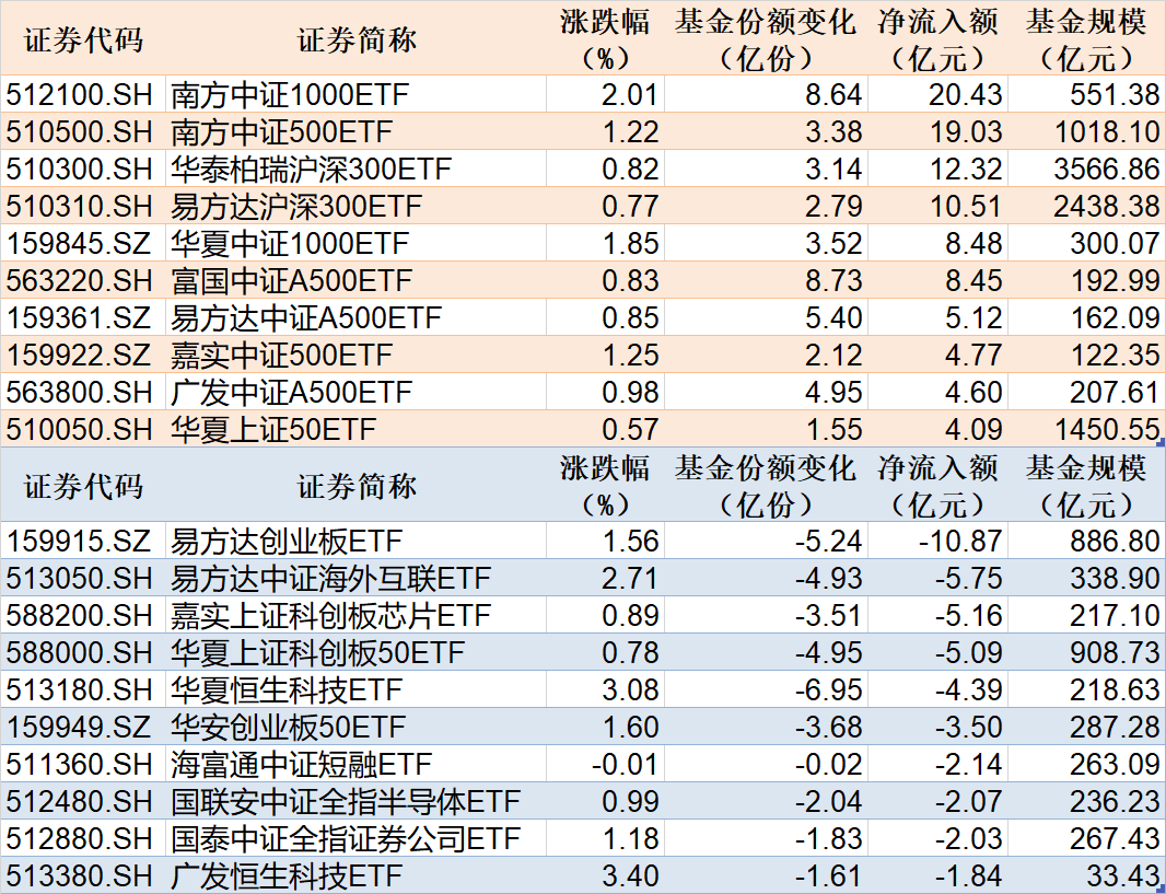 ETF规模速报 | 中证1000ETF净流入超20亿元,26只中证A500ETF合计净流入超33亿元