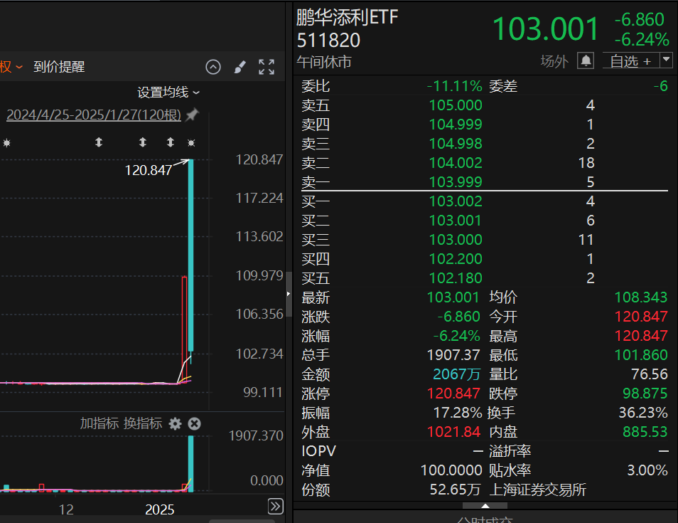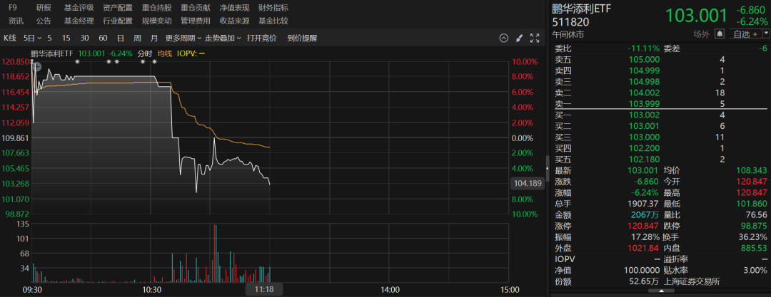 以鹏华添利ETF为例,早盘一度涨停,但从10点32分开始跳水,10点53分跌幅高达7.28%,截至上午收盘下跌6.24%,振幅高达17.28%。下午开盘后继续跳水,跌幅超过8%。