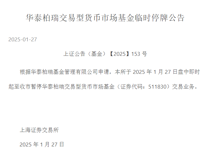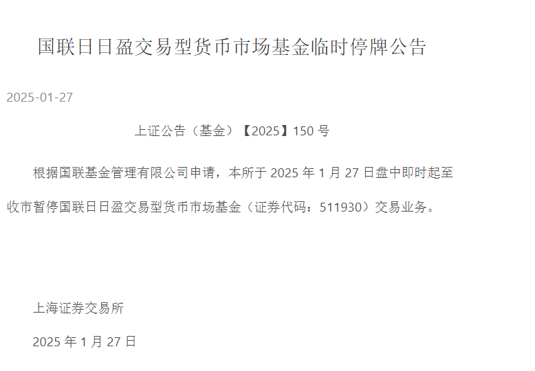 以国联日盈货币ETF为例,公告显示,根据国联基金管理有限公司申请,上海证券交易所于2025年1月27日盘中即时起至收市暂停国联日日盈交易型货币市场基金(证券代码:511930)交易业务。