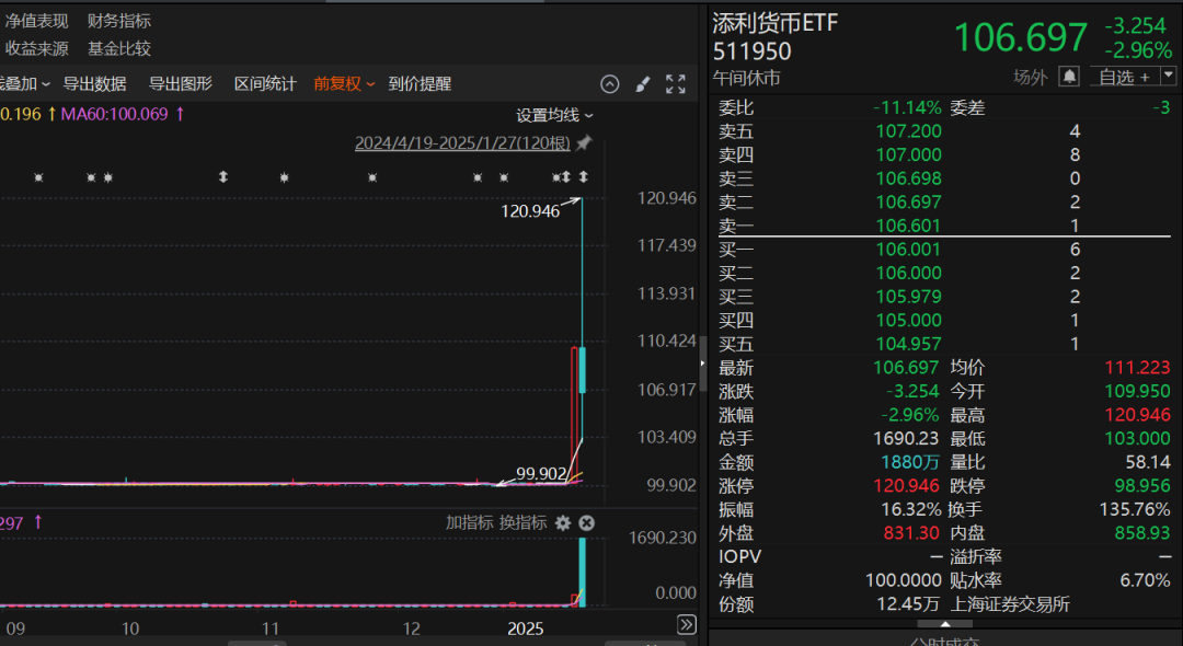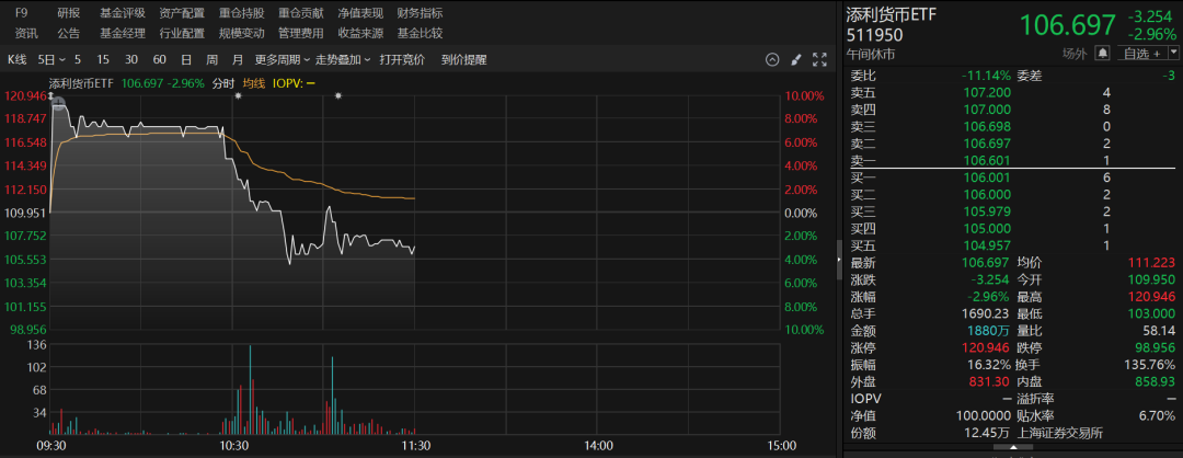 类似的还有广发添利货币ETF,早盘一度接近涨停,但此后开始跳水。