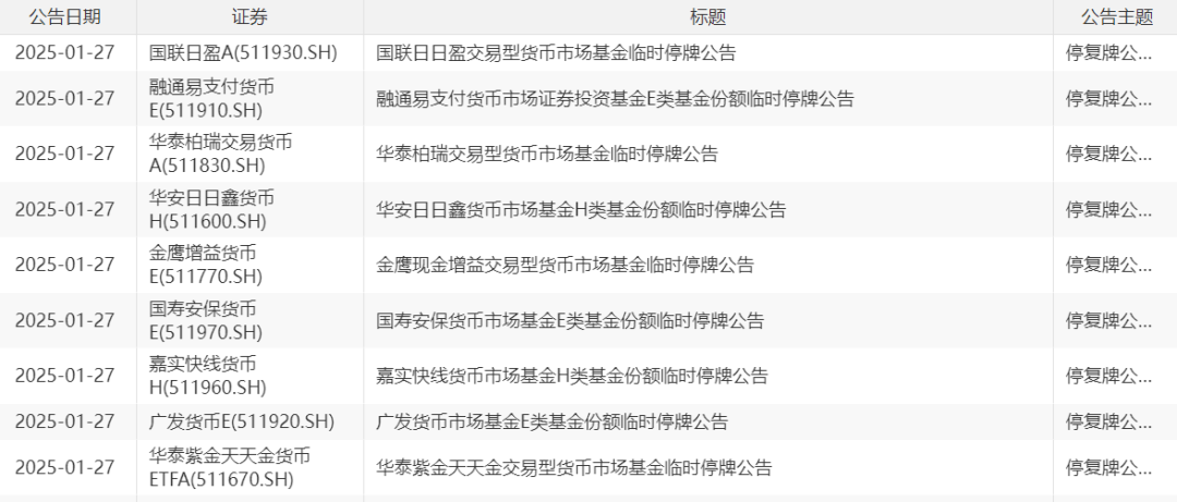 1月27日午间,9只货币ETF突发公告,下午停牌。