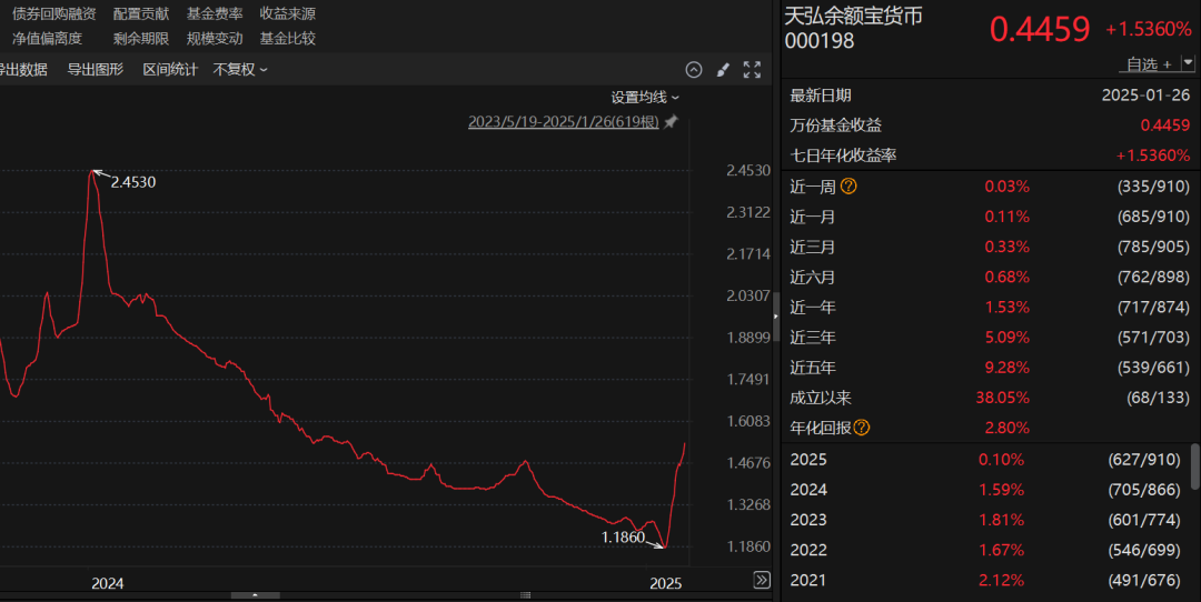 以规模最大的天弘余额宝货币基金为例,今年1月13日,7日年化收益率跌至1.186%,创出历史新低。不过,随着春节的临近,近期7日年化收益率出现反弹,1月26日涨至1.536%。