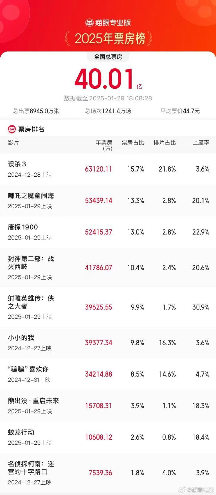 据猫眼专业版数据,2025年1月29日18时08分,2025年度票房(含预售实时)破40亿。