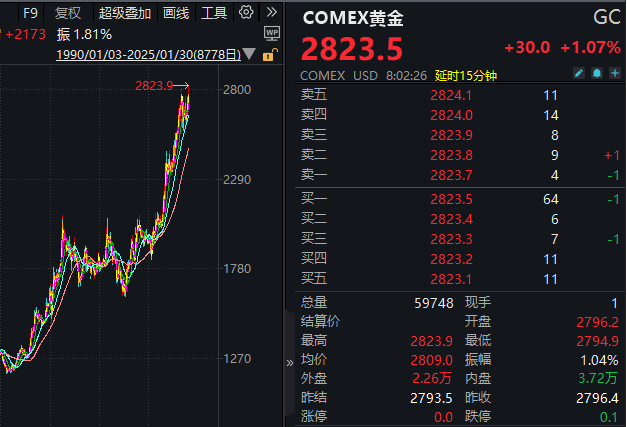1月30日,COMEX黄金价格创历史新高。截至发稿,COMEX黄金上涨1.07%,报2823.5美元/盎司。