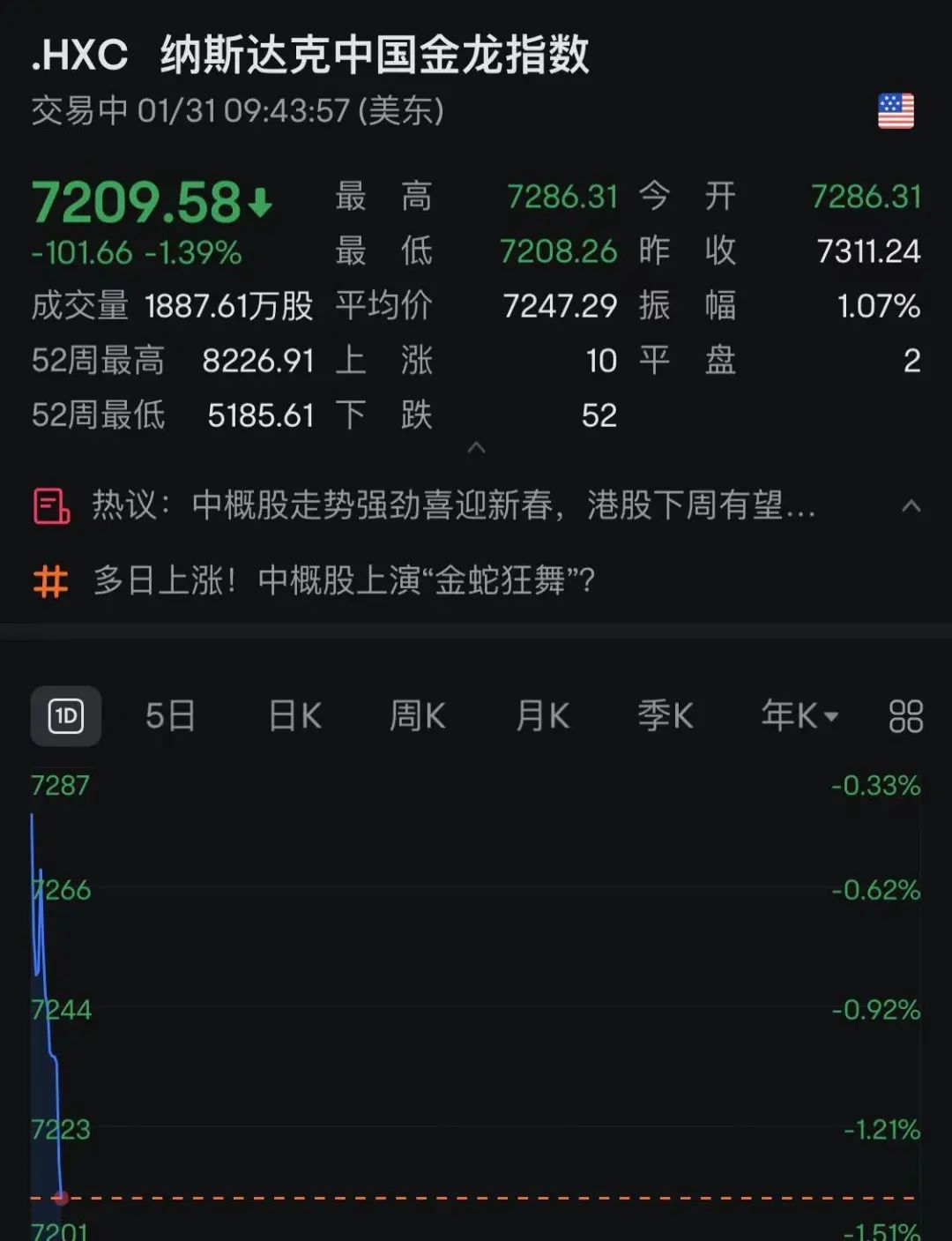 而此前连续拉涨的中概股陷入调整,其中,纳斯达克中国金龙指数跌约1.4%,个股方面,中进医疗跌超5%,虎牙跌超2%。而在下周,港股即将率先开盘。